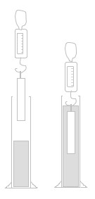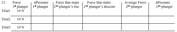 10.0 N. MAINTAIN this 10 newtons throughout the activities that follow. The smaller plunger should start to rise. Observe carefully what the minimum force on the smaller plunger is that stops the rising. What is the minimum force that causes the smaller plunger to start going downward? Determine the minimum to stop the rise and to start the decent several times. Unfortunately, in addition to forces arising from your push and the pressure in the fluid, there is also pretty significant friction between the sides of the syringes and the plungers. When making the second plunger RISE, this friction would have REDUCED the force needed on the second spring scale to match the change in pressure. When making the second plunger DESCEND, the friction would have INCREASED the force on the second spring scale. Thus the averaging of the two values should remove the effect of the friction.