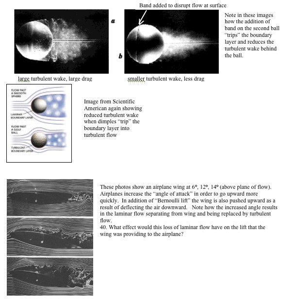 When the Reynolds number reaches 100,000 there is another transition in flow from the large turbulent wake that began at about 2300 to a very thin layer of turbulence right at the surface with laminar flow elsewhere. This loss of turbulent wake means a dramatic decrease in drag. Drag is the name given to retarding forces in a fluid. Without this effect baseballs would not be able to be hit for homeruns. It is also possible to achieve this boundary layer turbulence by Òtripping the boundary layer.Ó The dimples on a golf ball and the fuzz on a tennis ball are designed to initiate turbulent flow at the surface and thus decrease the drag.