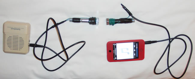 - Plug on end of the 1/8" mono cable into the amplifier. Turn on the amplifier and turn it all the way up. You should mot hear anything. Plug the other bolt into the headphone jack into a sound source, such as an iPod. Play a song on the iPod and turn it up loud. Place the two bolts about 1/2 inch apart and you should hear the iPod through the amplifier.