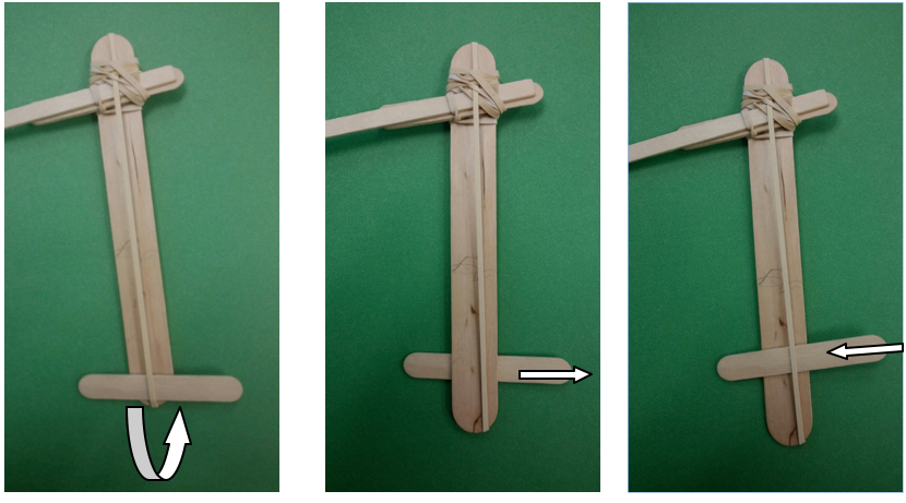 - Change the tension in the rubber band by increasing the tension in the band by moving the small craft stick down and around back, pulling some band with it. Then slid it back in the original position. Each time you do this it will make the front side of the band have more tension in it.